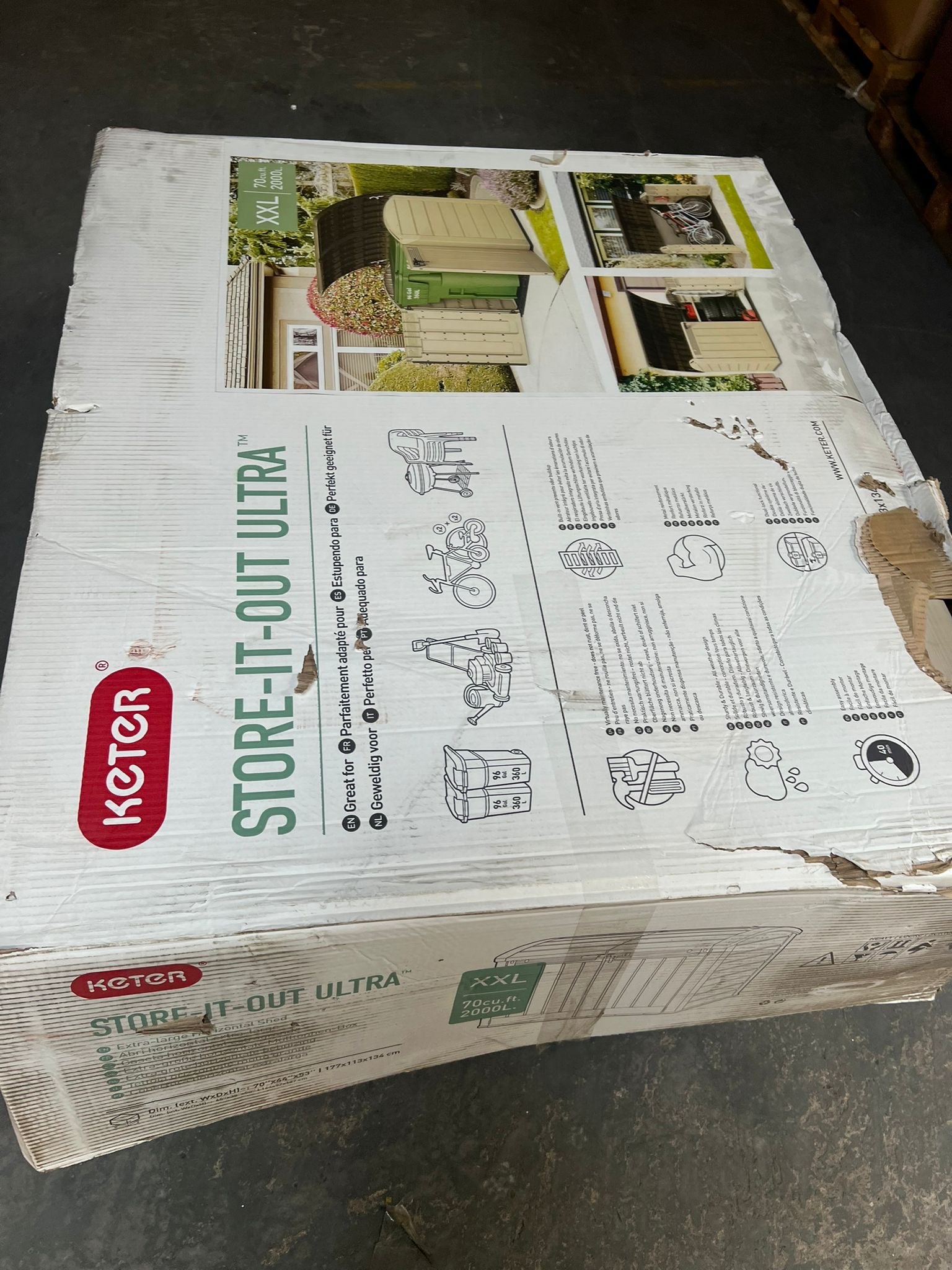 This Store-It-Out Ultra shed is the ultimate outdoor storage solution and bike store that will fit anywhere within your garden or patio area. With a storage capacity of 2000 L/530 G this storage shed is perfect as a bike store or alternatively can hold two 360L or three 140L wheelie bins, or items like barbecues, lawn mowers and garden furniture, while shelves can be placed inside for increased storage options. It has a durable, weather-resistant build that keeps contents both dry and ventilated. It can be opened from the top or from the front and is designed with a sloped threshold that makes it easy to wheel items in or out and has an easy-opening lid with hydraulic pistons. This storage bin is easy to bring home, easy to move around , easy to assemble, lockable and comes with a bin opening kit.
